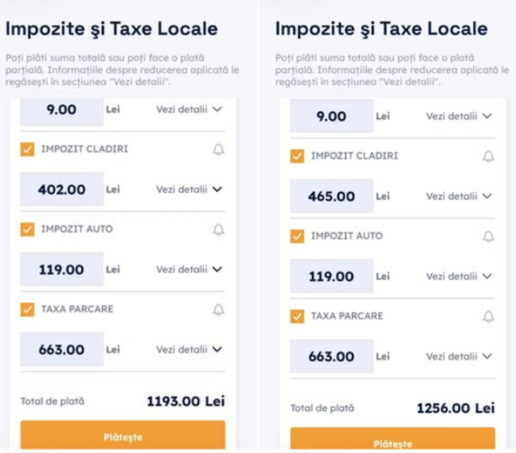 Alt bucureștean a postat chiar și capturi de ecran realizate pe platforma Ghișeul.ro. Una din ele este făcută luni după-amiază, atunco când impozitul pe clădire era 402 lei, iar în cea de-a doua captură făcută marți dimineață același impozit era 565 de lei.