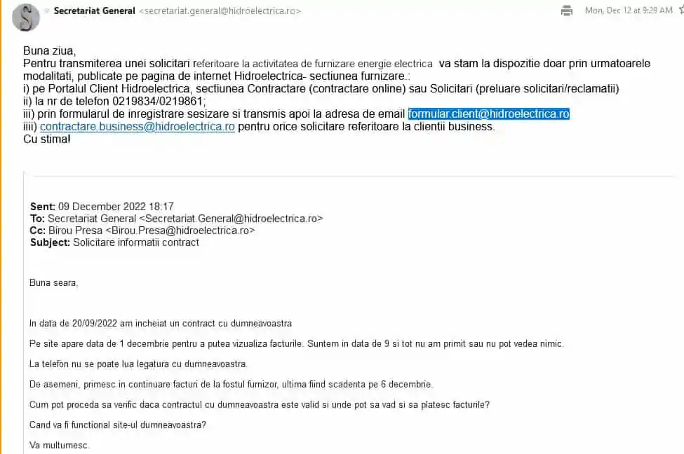 Încercările clienților de a contacta compania pentru noi informații cu privire la facturare și la plata energiei consumate s-au transformat în adevărate aventuri, de la emailuri fără răspuns la convorbiri telefonice interminabile cu roboți.
