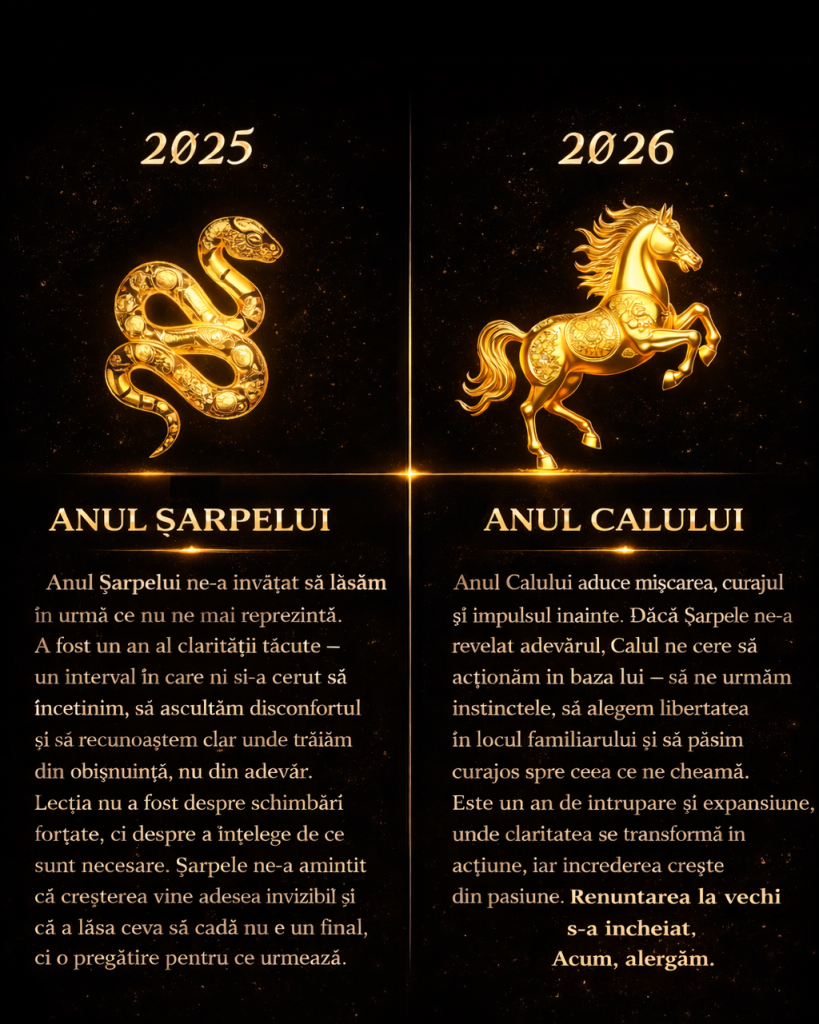 Horoscop chinezesc: Șarpele nu ne-a grăbit; dimpotrivă, ne-a cerut să ne oprim, să ascultăm disconforturile pe care le-am ignorat prea mult timp. Ne-a arătat clar unde trăiam din obișnuință, nu din adevăr, unde ne făceam mici doar pentru că ni se părea mai sigur decât să fim văzuți cu adevărat. Creșterea în Anul Șarpelui nu vine prin forță sau presiune. Vine prin conștientizare. Prin onestitate. Prin decizia curajoasă de a lăsa ceva vechi să cadă, chiar și atunci când nimeni altcineva nu putea înțelege de ce.