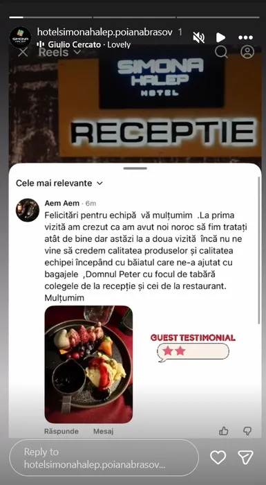 „Felicitări pentru echipă, vă mulțumim! La prima vizită am crezut că am avut noi noroc să fim tratați atât de bine, dar astăzi, la a doua vizită, încă nu ne vine să credem calitatea produselor și calitatea echipei, începând cu băiatul care ne-a ajutat cu bagajele. Domnul Peter cu focul de tabără, colegii de la recepție și cei de la restaurant. Vă mulțumim!”, a fost mesajul turistului, publicat pe contul oficial de Instagram al Hotelului Simona Halep din Poiana Brașov.
