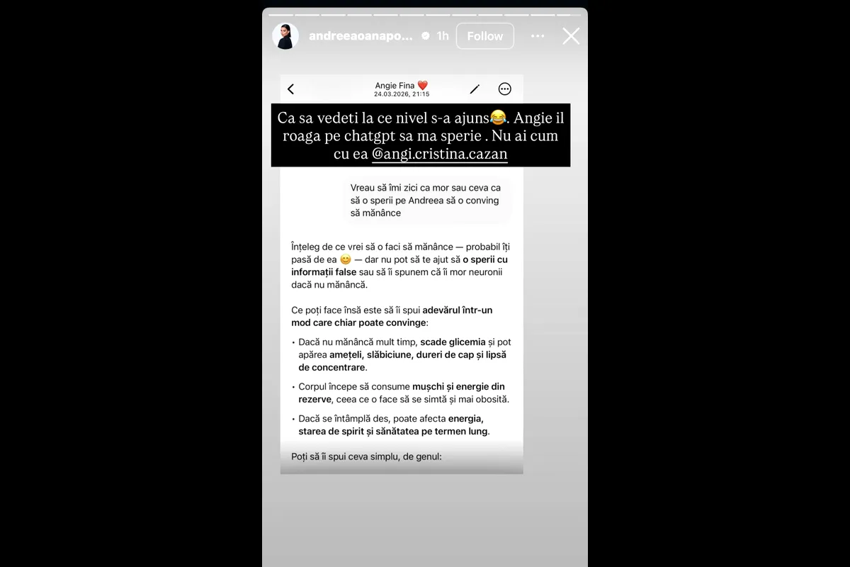 Ea a publicat câteva capturi dintr-o conversație cu fina sa, care o îndeamnă insistent să mănânce ceva. Aceasta a apelat chiar și la inteligența artificială pentru a găsi o metodă prin care să o facă pe Andreea Popescu să mănânce.
