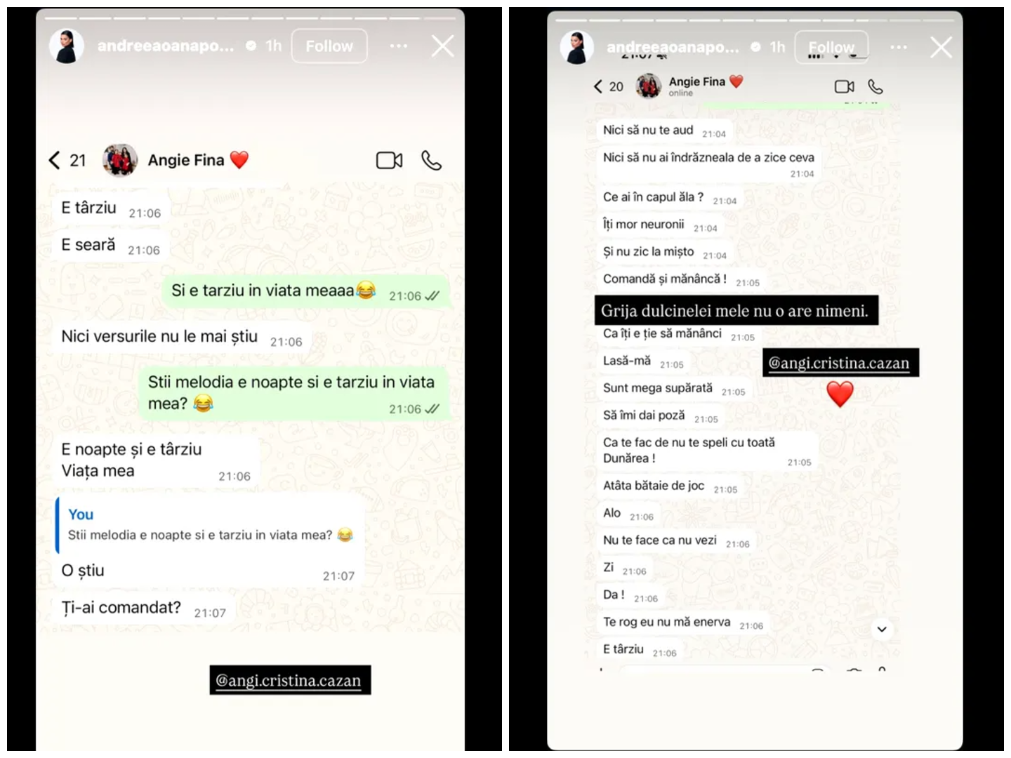 Fina: Nici să nu te aud. Nici să nu ai îndrăzneala de a zice ceva. Ce ai în capul ăla? Îți mor neuronii. Și nu zic la mișto. Comandă și mănâncă. Sunt mega supărată. Să îmi dai poză, că te fac de nu te speli cu toată Dunărea. Atâta bătaie de joc. Alo!!! Nu te face că nu vezi. Te rog să nu mă enervezi. E târziu. E seară.