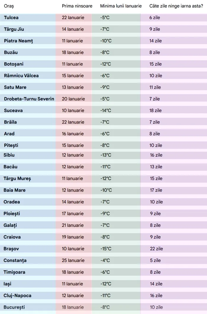 Cluj-Napoca și Sibiu nu fac excepție. Ambele ar putea avea în jur de 16 zile cu ninsoare și temperaturi minime de -11, respectiv -13 grade Celsius.
