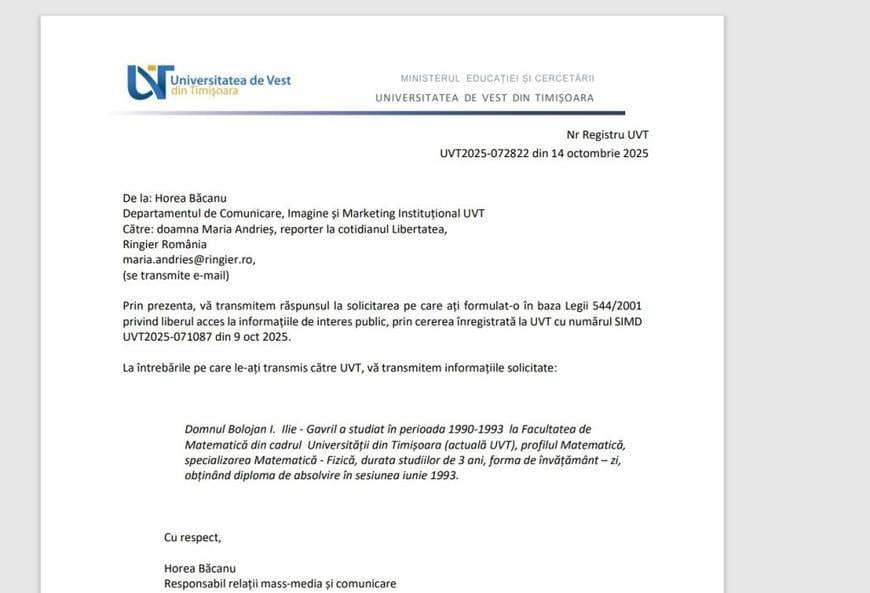 Întrebată ce fel de studii a absolvit Ilie Bolojan, conducerea Universității de Vest a comunicat următoarele pentru Libertatea.