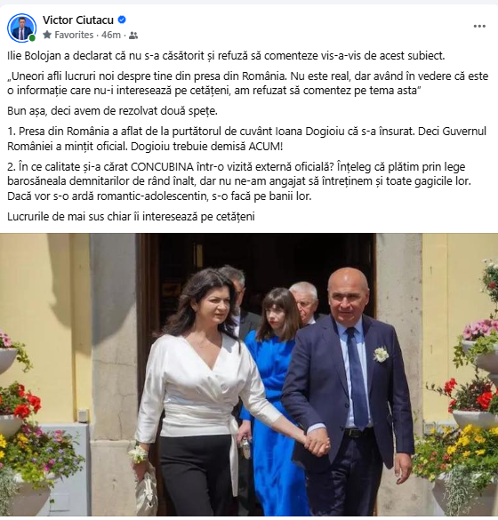 Victor Ciutacu a comentat pe Facebook declaraţiile premierului: „Ilie Bolojan a declarat că nu s-a căsătorit și refuză să comenteze vis-a-vis de acest subiect.