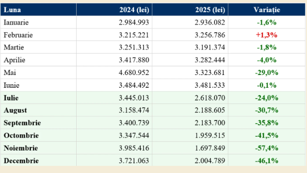 Cea mai mare reducere a cheltuielilor a fost înregistrată în semestrul al doilea al anului 2025, când s-au cheltuit 12,7 milioane de lei, cu aproape 40% mai puțin decât în aceeași perioadă din 2024 și cu peste 41% sub nivelul din 2023. În prima jumătate a anului, reducerea față de 2024 a fost de 7,4%