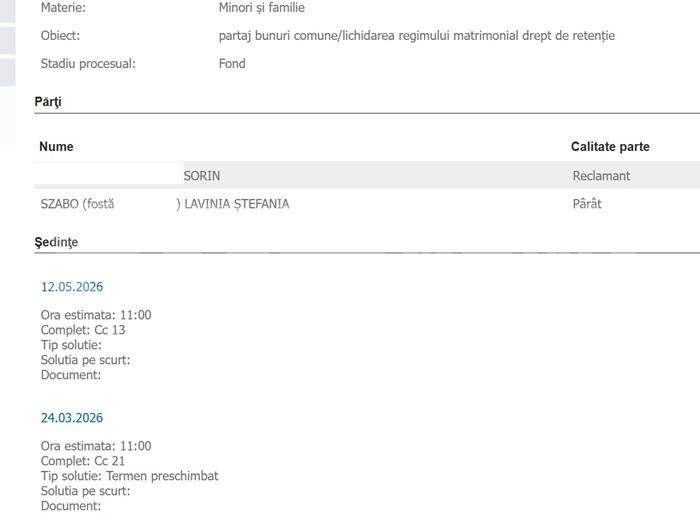 Fostul soț al doctoriței, fostul ofițer DGA, în prezent pensionat din MAI și angajat recent într-o instituție publică din București, își menține demersurile în instanță, în procesul de partaj, privind o firmă de consultanță al cărei sediu social se află în locuința în care a locuit împreună cu Ștefania Szabo. Înainte de moartea doctoriței, bărbatul obținuse o hotărâre judecătorească prin care a inventariat bunurile din imobil.