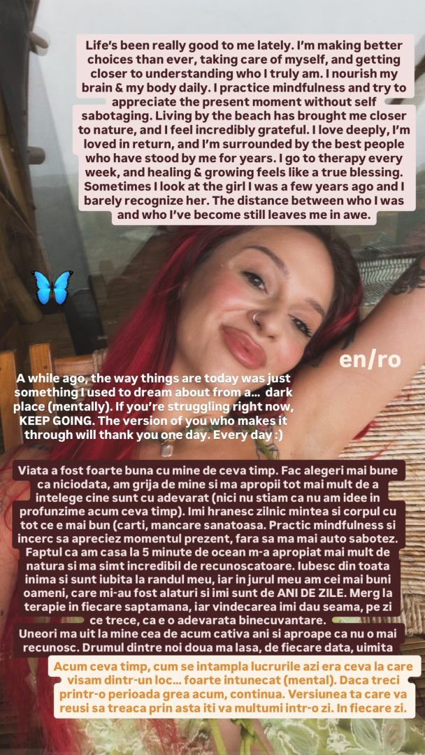 Merg la terapie în fiecare săptămână, iar vindecarea imi dau seama pe zi ce trece ca e o binecuvântare. (…) Acum ceva timp, cum se întâmplă lucrurile azi, era ceva la care visam dintr-un loc… foarte întunecat mental”, a declarat Marilu Dobrescu, pe Instagram.