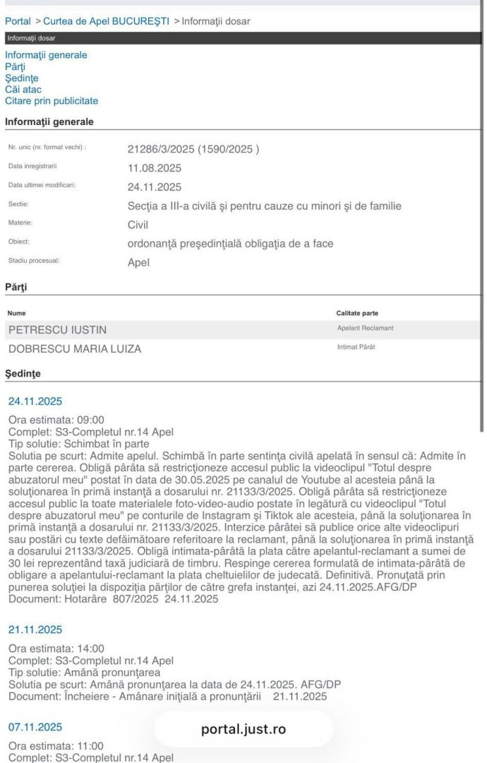 Instanța a admis apelul lui Iustin Petrescu, iar Marilu Dobrescu este obligată acum să ia măsuri asupra conținutului postat.