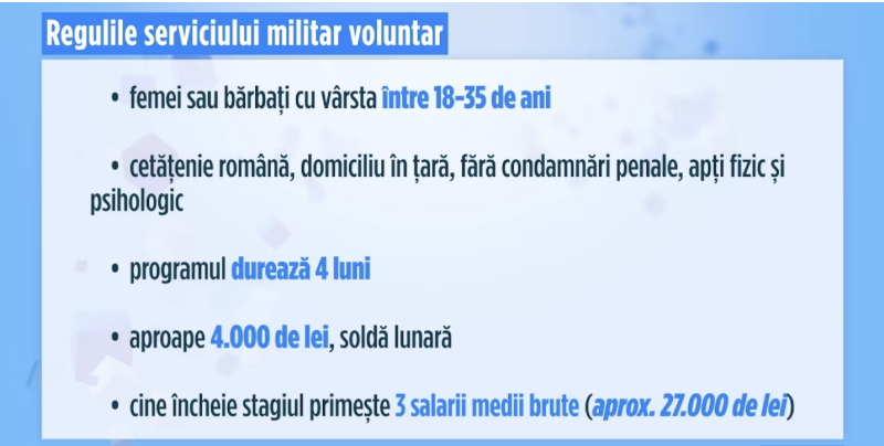 17.09.2025-BAROMETRUL-Informat.ro-INSCOP-Stagiul-militar-voluntar (1)Persoanele care vor să se înscrie în programul de pregătire militară voluntară trebuie să aibă cetățenie română, domiciliul în țară, să aibă cazierul curat și să treacă de procesul de selecție în urma căruia vor fi declarați apți din punct de vedere fizic și psihologic.