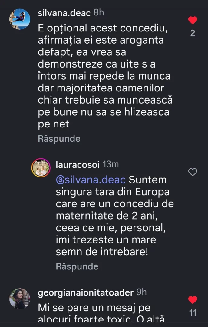 „Mi se pare un mesaj pe alocuri foarte toxic. O altă presiune care se arunca pe mame. Să se regăsească. O data cu copilul se naște și mama. Nu mai ești niciodată același om. Te transformi și e normal. Mesajul ar trebuit să fie îndreptat către societate care ar trebui să învețe să integreze mamele și sa le dea o șansă să muncească și sa facă și copii”, a scris Georgiana Ioniță Toader, jurnalistă și mamă a unei fetițe.