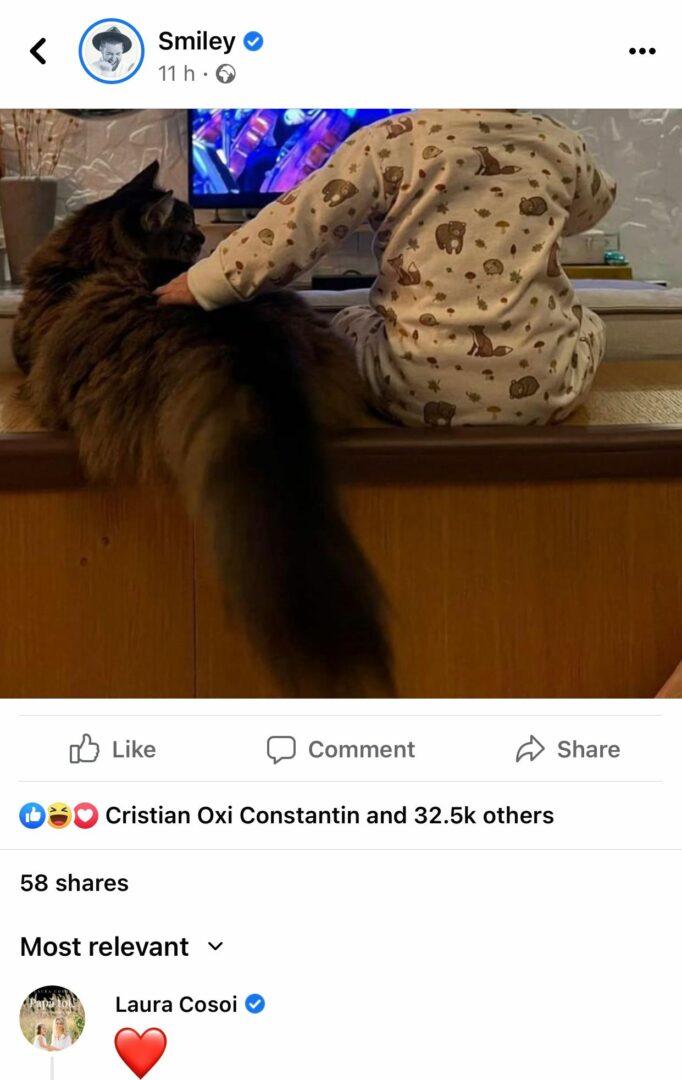 Fanii au fost extrem de surprinşi când au văzut că Laura Cosoi a lăsat un comentariu la fotografie. Actriţa a pus o inimă roşie, semn că adoră ceea ce vede în imagine, respectiv pe fiica lui Smiley şi a Ginei Pistol, şi motanul acestora. Sute de persoane au reacţionat la mesajul fostei iubite a juratului de la SuperStar.