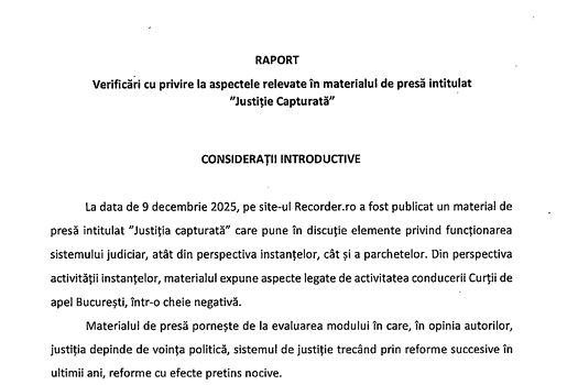 După verificări extinse, Inspecția Judiciară concluzionează – în raportul transmis CSM și consultat de Mediafax – că niciuna dintre acuzațiile prezentate în materialul jurnaliștilor nu se confirmă factual. Ba chiar filmul Recorder conține omisiuni și situații descrise selectiv și subiectiv.