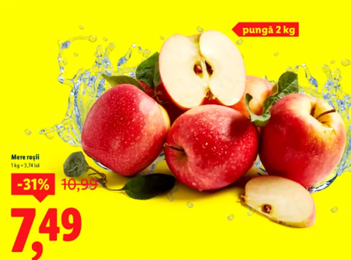 Cea mai mare reducere din această perioadă este aplicată merelor roșii, promoția fiind de 31%. Astfel, prețul coboară la 7,49 lei pentru o pungă de 2 kilograme de mere, față de prețul anterior de 10,99 lei. Aceasta este cea mai mare reducere din campania promoțională actuală a cunoscutului retailer.