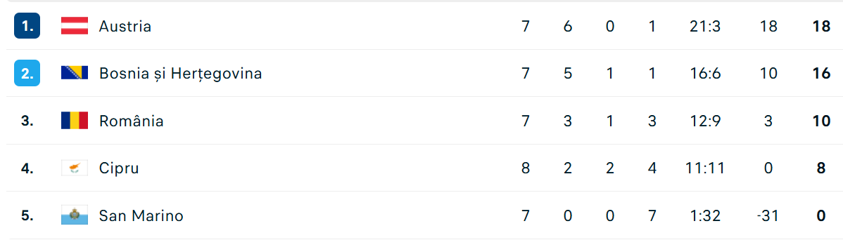 Pentru a fi sigur pe locul doi, România are nevoie să câștige cu Bosnia și San Marino și Bosnia să nu o bată pe Austria în ultima etapă.