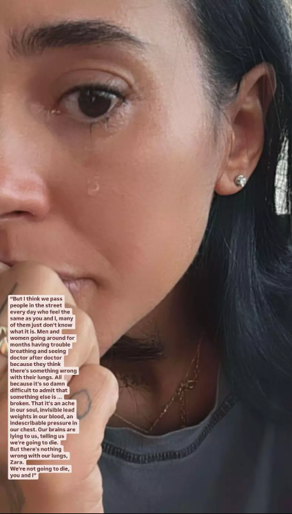 Este o durere în sufletele noastre, invizibilă, care ne curge prin sânge, o presiune în pieptul nostru ce nu poate fi descrisă. Creierele noastre ne mint, ne spun că suntem pe cale să murim. Dar nu e nimic greșit cu plămânii noștri, Zara. Nu suntem pe cale să murim, nici eu, nici tu”, a continuat ea.