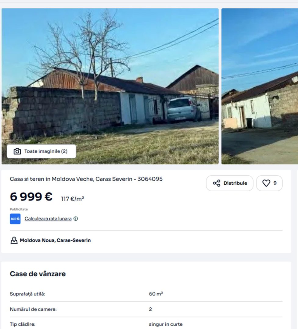 ”Acest imobil se valorifică în cadrul unei lictații publice. Proprietate construită din teren intravilan, cu suprafața de 104 mp, și construcție edificată pe aceasta, cu suprafața de 60 mp, situate în localitatea Moldova Veche, Caraș Severin. Locuința este în regim de înălțime P, construcție nefinalizată”, se arată în anunțul vânzătorului, potrivit Cancan.ro.
