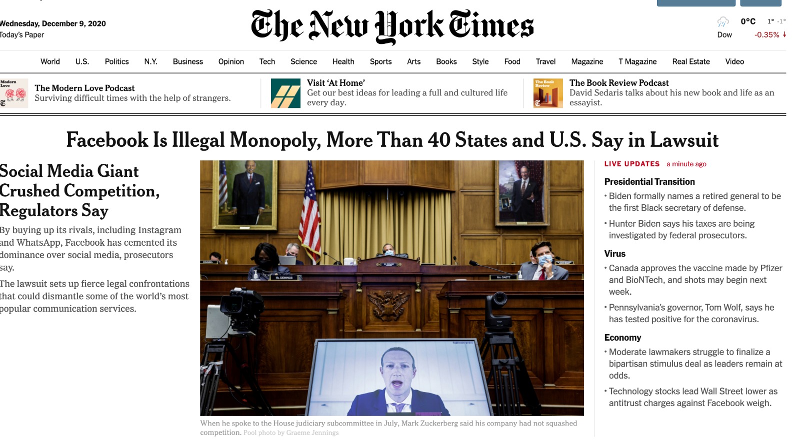 Autoritățile de reglementare federale și de stat, care investighează compania de peste 18 luni, au declarat în procese separate că achizițiile făcute de Facebook, în special Instagram, pentru 1 miliard de dolari, în 2012 și WhatsApp, pentru 19 miliarde de dolari, doi ani mai târziu, au eliminat concurența care ar fi putut reprezenta într-o zi o provocare pentru compania condusă de Mark Zuckerberg.