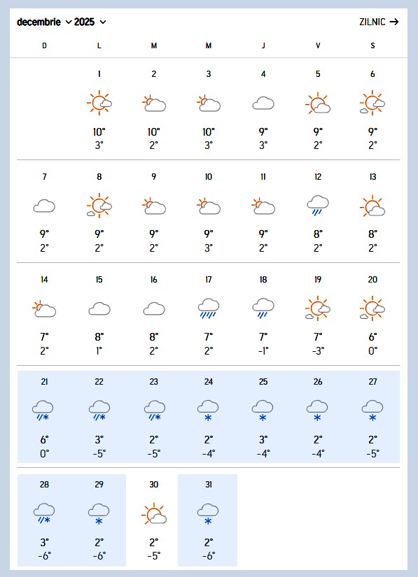 Potrivit prognozei meteorologice, începutul lunii decembrie va fi unul înșelător. Sunt așteptate temperaturi de până la 10 grade Celsius și cer mai mult senin. Până în jurul datei de 18 decembrie, temperaturile vor fi peste media normală a perioadei, între 7 și 10 grade ziua și valori pozitive inclusiv pe parcursul nopților.