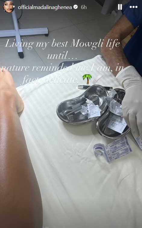 Alături de fotografia în care apare pe un pat de spital alături de un medic, frumoasa actriță a transmis și un mesaj din care a lăsat să se înțeleagă că a ajuns la spital din cauza unei întâmplări nefericite din vacanță.