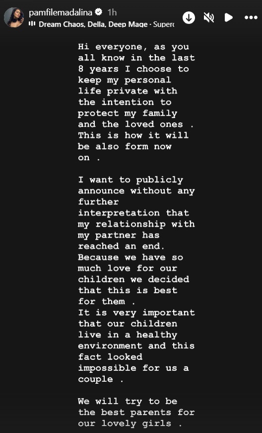 Mădălina Pamfile a fost cea care a anunțat despărțirea, printr-un mesaj postat pe rețelele sociale. Fosta concurentă de la Bravo, ai stil! a precizat că vrea să își țină în continuare privată viața personală, însă trebuie să anunțe că ea și tatăl fetițelor sale nu mai formează un cuplu.