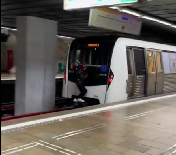 Există şi veşti mai puţin plăcute de la metrou.Imagini cu un tânăr care circulă în spatele unei garnituri de metrou au fost publicate online, iar Poliţia Capitalei încearcă să identifice persoana.