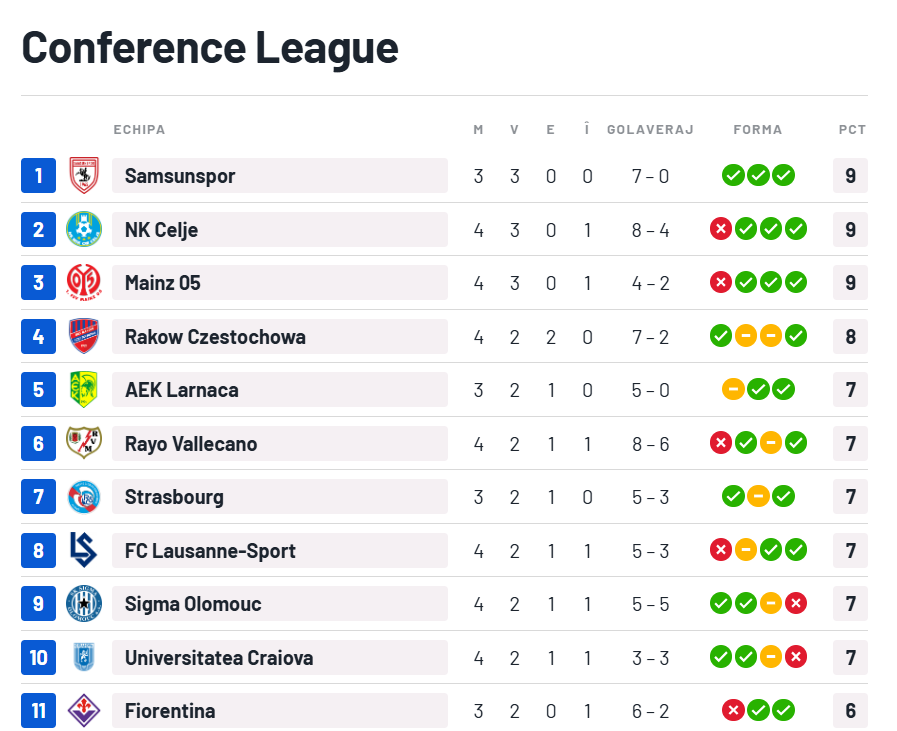 Cu acest succes, oltenii acumulează 7 puncte şi urcă până pe locul 10 în ierarhia din Conference League, înaintea meciurilor de la 22:00