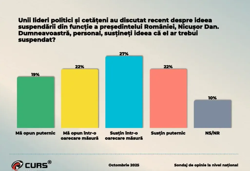 În privința posibilei suspendări a președintelui României, 49% dintre respondenți ar susține, într-o anumită măsură, această idee, în timp ce 41% se opun, iar 10% nu au o opinie.