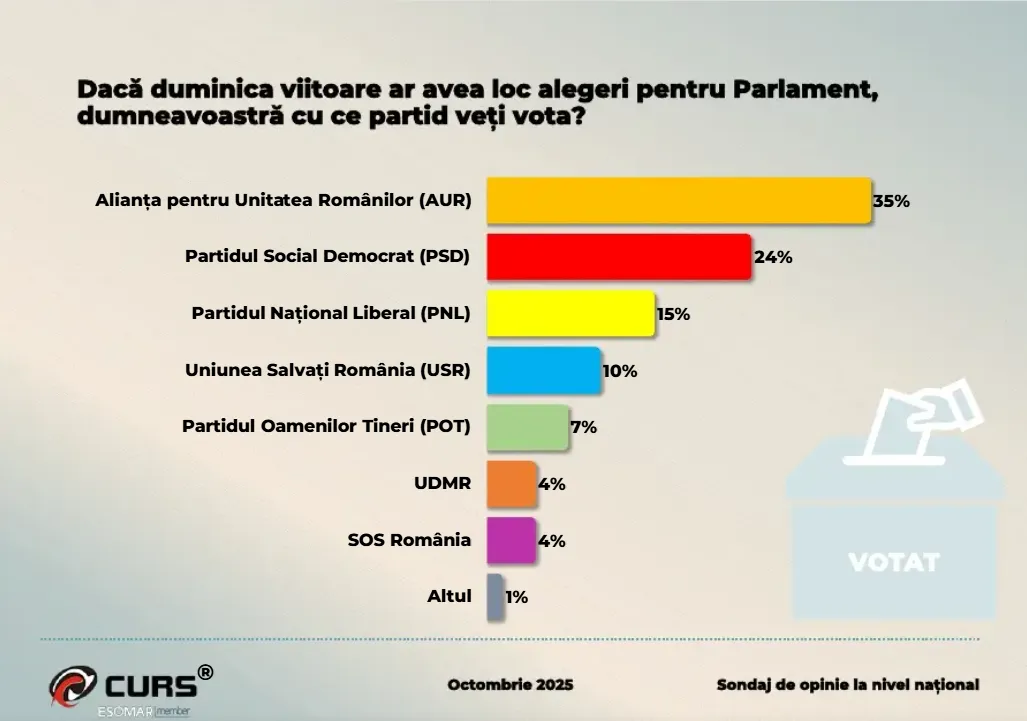 Dacă duminica viitoare ar avea loc alegeri pentru Parlament, 35% dintre români ar vota cu Alianța pentru Unitatea Românilor (AUR), 24% cu Partidul Social Democrat (PSD), 15% cu Partidul Național Liberal (PNL), 10% cu Uniunea Salvați România (USR) și 7% cu Partidul Oamenilor Tineri (POT).