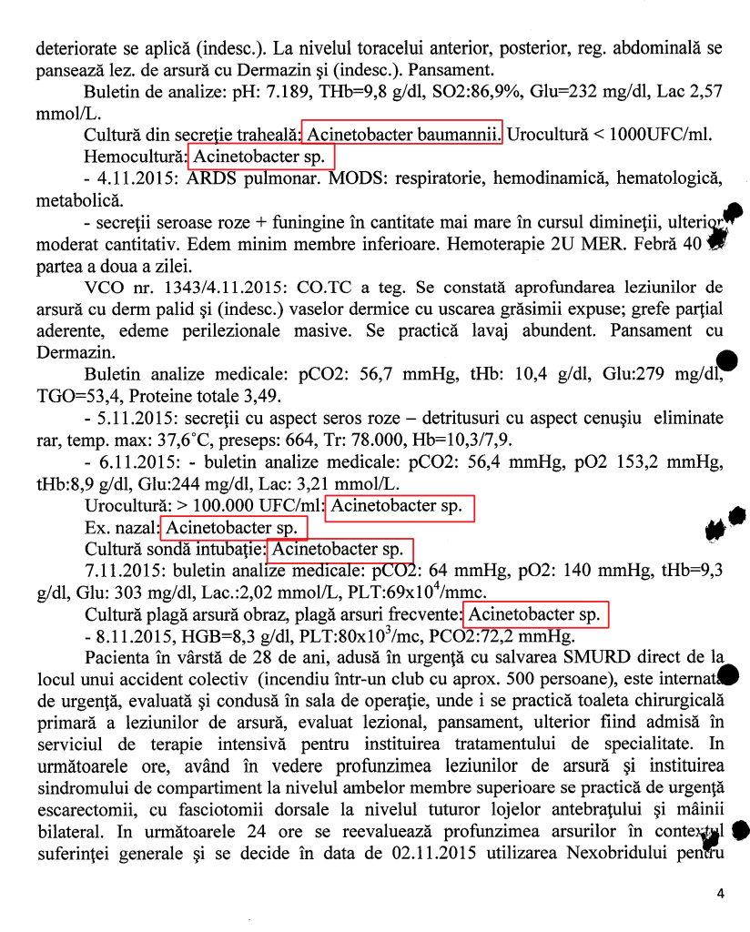 Pe 3 noiembrie 2015, analizele de laborator efectuate la Sf. Ioan indicau pentru prima dată de la internare prezența infecției cu Acinetobacter baumannii în cultura din secreția traheală și în hemocultură. Ulterior, pe 8 noiembrie 2015, în ziua în care Andreea a ajuns într-un final în Germania, medicii de la Spitalul Universitar Bergmannsheil au identificat și infecția cu Klebsiella pneumoniae.