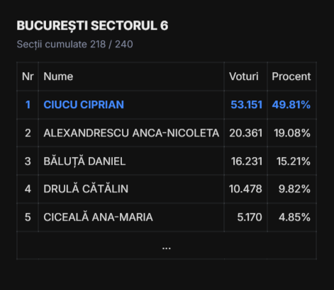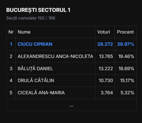 La Sectorul 1, Ciprian Ciucu are 28.272 de voturi, cu un procent de 39.97%. Este urmat de Anca Alexandrescu, cu 19.46%, de Daniel Băluță, cu 18.69%, de Cătălin Drulă, cu 15.17% și de Ana-Maria Ciceală, cu 5.32%. Asta după numărarea a 150 din 166 de secții.
