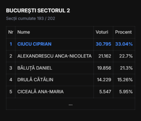 La Sectorul 2, primarul Sectorului 6 a obținut 33.04% din voturi, urmat de Anca Alexandrescu, cu 22.7%, Daniel Băluță cu 21.3%, Cătălin Drulă cu 15.26% și de Ana-Maria Ciceală cu 5.95%. Asta după numărarea a 193 din 202 secții de votare.