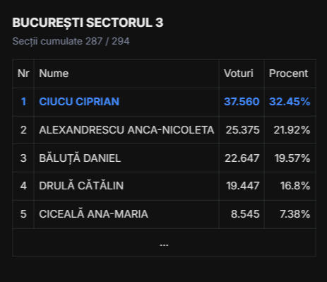 Ciprian Ciucu este învingător în toate sectoarele din București, mai puțin în unul, Sectorul 4, condus de Daniel Băluță. Totuși, nici acolo diferența nu este mare, pentru că primarul PSD conduce cu aproximativ 800 de voturi, la numărarea a 172 din 189 din secțiile de votare.