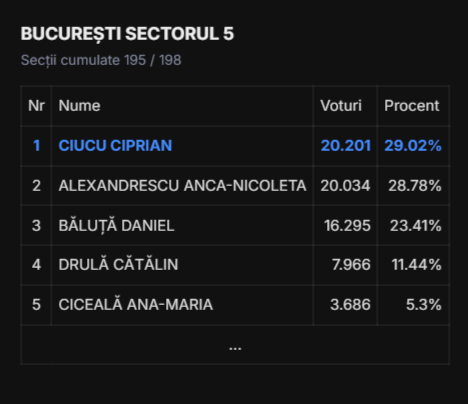 În fine, la Sectorul 5, Ciprian Ciucu este pe primul loc, cu 29.02%, însă este urmat foarte aproape de Anca Alexandrescu, ce a obținut 28.78%, de Băluță Daniel, cu 23.41%, de Cătălin Drulă, cu 11.44%, și de Ana-Maria Ciceală, cu 5.3%. Asta după 195 din 198 din secții de votare numărate.