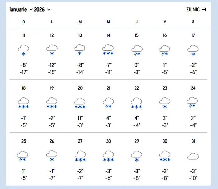 Conform prognozelor Accuweather, valorile termice nocturne vor fi negative în ianuarie, situându-se între -17 și -3 grade Celsius, iar vremea geroasă va persista în special în zonele montane.