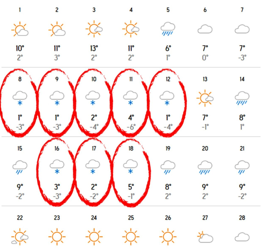 Vremea începe să se îmbunătățească spre finalul lunii, atunci când temperaturile mazxime vor ajunge la 12 grade, iar minimele vor fi de -3 grade Celsius pe timpul nopții.
