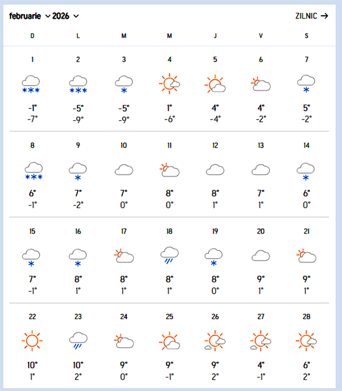 Zilele următoare mențin acest regim termic ridicat pentru final de iarnă: 9 grade pe 24 și 25 februarie, apoi din nou 9 grade pe 26 februarie. Chiar dacă minimele mai coboară ușor sub 0 grade în unele nopți, amplitudinea termică este clar specifică unei perioade de tranziție spre primăvară. Luna se încheie cu maxime de 4–6 grade pe 27 și 28 februarie, sub cer variabil, dar fără reveniri la gerul sever de la început.