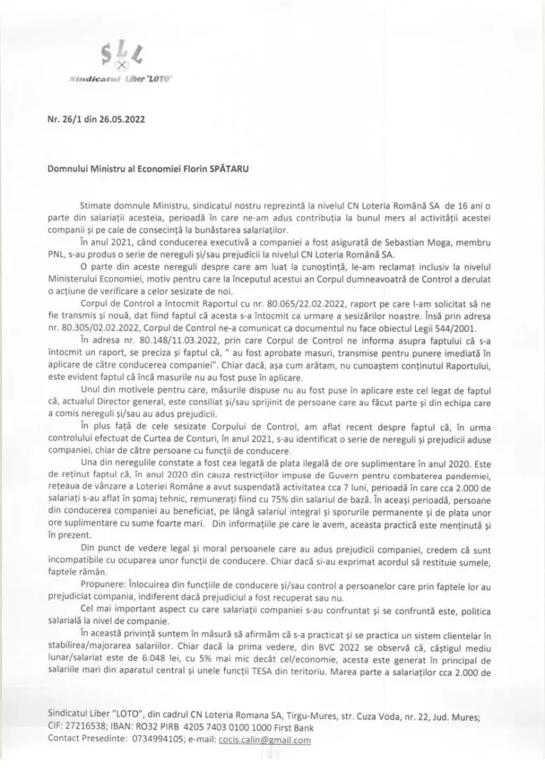 Un nou scandal zguduie Loteria Română, instituție strategică pentru bugetul de stat și economia țării! Președintele Sindicatului Liber ”Loto” de la CN Loteria Română SA, Călin Orlando Cociș, susține într-o adresă recentă (vezi documentul în facsimil) către ministrul Economiei, Florin Spătaru, că s-au mușamalizat constatările și măsurile controlului efectuat de Corpul de control al ministerului la această companie.