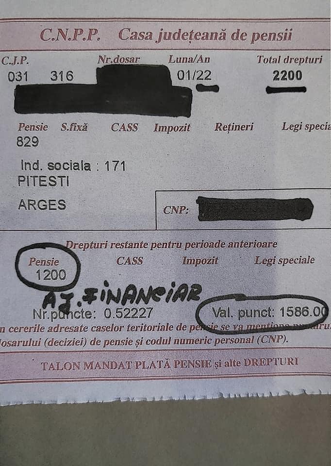 Alături de acest mesaj, ministrul a postat şi un talon de pensie potrivit căruia punctul de pensie este de 1.586 lei.