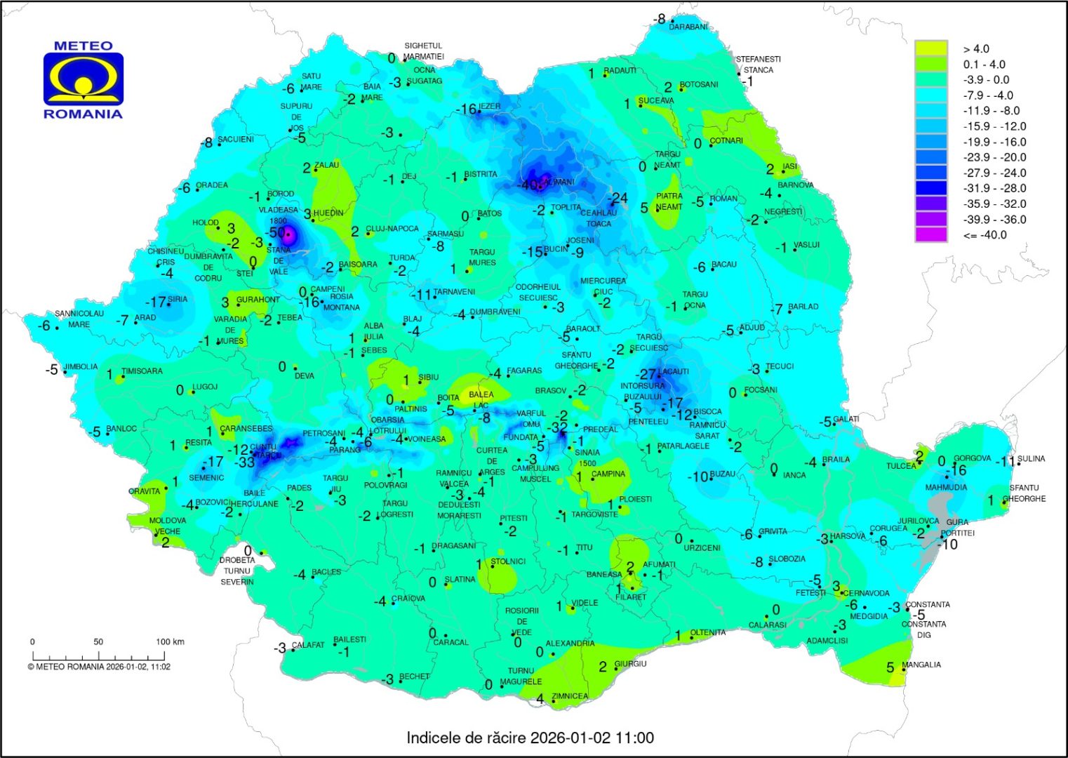 Astfel ca la Vârful Vlădeasa, județul Cluj, temperatura resimțită scăzuse până la minus 50 de grade conform ANM.