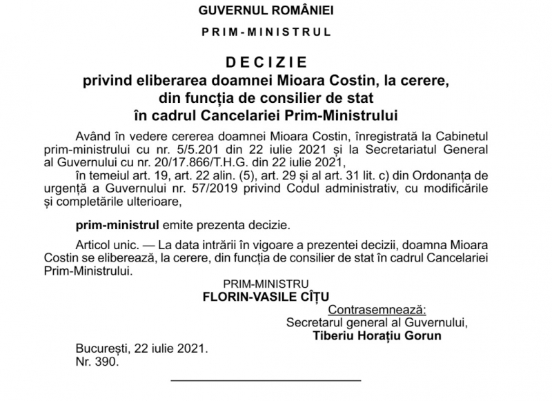 „Începând cu data intrării în vigoare a prezentei decizii, doamna Mioara Costin se numeşte în funcţia de consilier de stat în cadrul Cancelariei Prim-Ministrului”, se arată în decizia semnată de premierul Florin Cîţu şi publicată joi seară în Monitorul Oficial.