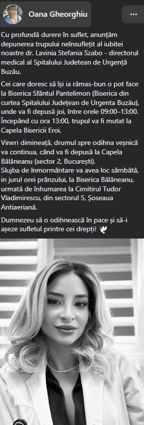 Trupul neînsuflețit al doctoriței Ştefania Szabo a fost ridicat de la Serviciul de Medicină Legală din Buzău și depus, joi, la Biserica Sf. Pantelimon (în curtea Spitalului Județean Buzău), apoi la Capela Bisericii Eroi.