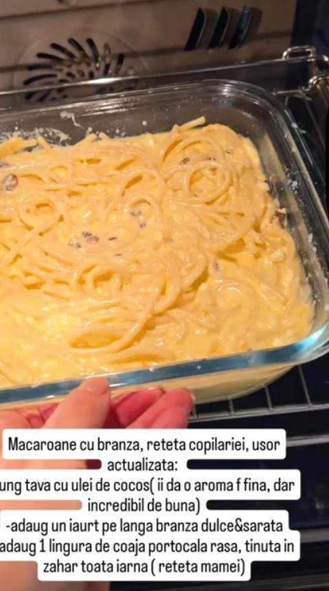 „Macaroane cu brânză, rețeta copilăriei, ușor actualizată… Ung tava cu ulei de cocos (îi dă o aromă foarte fină, dar incredibil de bună). Adaug un iaurt pe lângă brânza dulce și sărată. Adaug 1 lingură de coajă de portocală rasă, ținută în zahăr toată iarna (rețeta mamei)”, a scris Monica Bîrlădeanu într-o postare pe rețelele sociale.