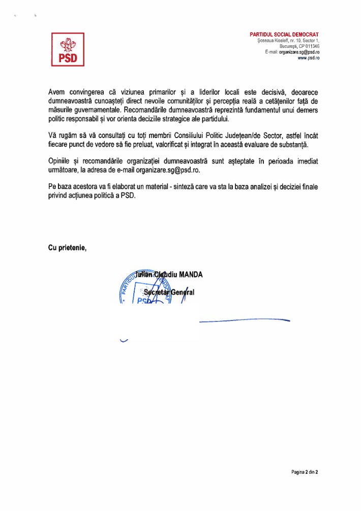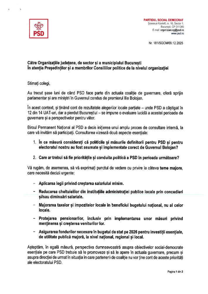 Documentul reprezintă o adresă semnată de secretarul general al PSD, Claudiu Manda, și transmisă liderilor locali, care sunt invitați să se exprime cu privire la măsura în care politicile definitorii ale PSD au fost implementate corect de Guvernul Bolojan și cu privire la stabilirea priorităților politice ale partidului pentru perioada următoare.