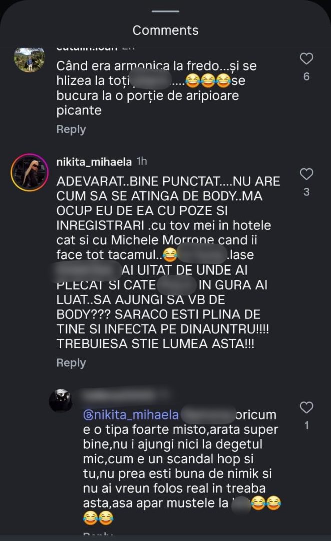 „ADEVARAT..BINE PUNCTAT….NU ARE CUM SĂ SE ATINGA DE BODI..MĂ OCUP EU DE EA CU POZE ȘI ÎNREGISTRĂRI .cu tovarășii mei în hotele cât și cu Michele Morrone când îi face tot tacâmul în **** lasă Ramona, ai uitat de unde ai plecat și câte **** ai luat…să ajungi să vorbești de Bodi? Săraco, ești plină de tine și infectă pe dinăuntru. Trebuie să știe lumea asta!!!”, este comentariul lăsat de Nikita la postarea publicată de Cancan.ro.