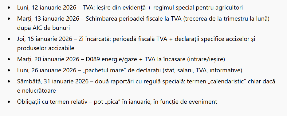– Practic: pentru contribuabilii din această zonă, ianuarie înseamnă „închiderea” raportărilor pentru luna anterioară (decembrie), plus eventuale raportări semestriale (pentru semestrul precedent).