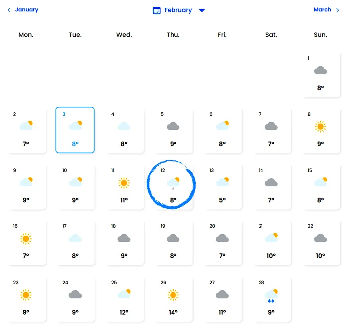 Meteorologii EaseWeather vin cu vești și pentru luna februarie 2026. În data de 12 februarie 2026 se vor înregistra precipitații sub formă de ninsoare, în București. Temperatura maximă nu va trece de 8 grade Celsius. De altfel, la data de 28 februarie 2026 va ploua, susțin meteorologii. Temperaturile maxime ale lunii se vor situa între 5 și 14 grade Celsius.