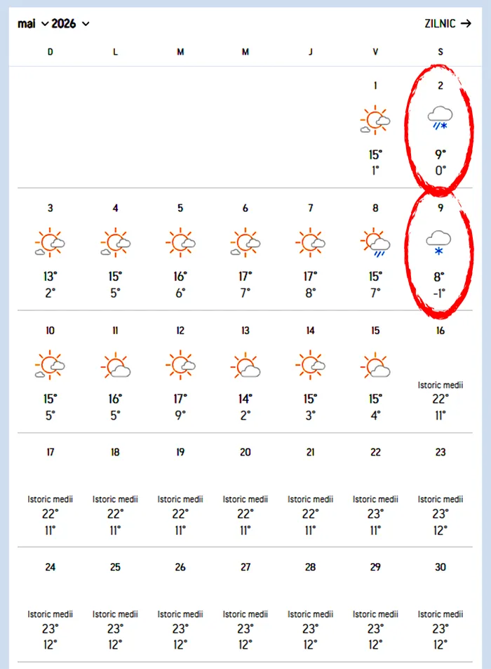 Şi începutul lunii mai va aduce vreme instabilă la munte. Prognoza disponibilă până la 15 mai indică în Predeal noi episoade de precipitații sub formă de ninsoare sau lapoviță, fiind posibil să avem zăpadă în primele zile ale lunii mai și în jurul datei de 9, când temperaturile nocturne vor coborî spre -1 grad Celsius.