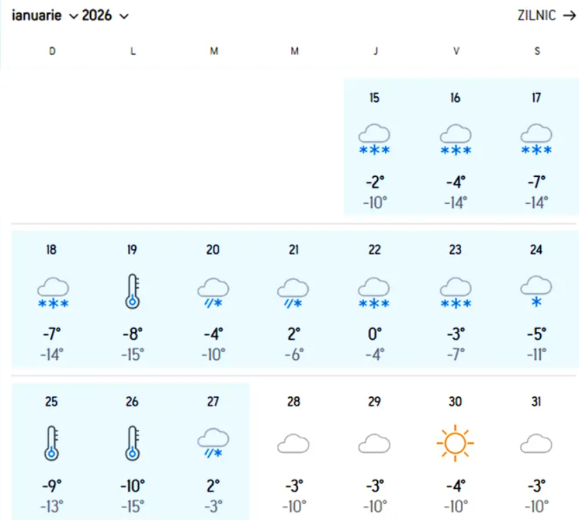 Joi, 29 ianuarie 2026: Temperatura maximă de -3 grade Celsius, temperatură minimă de -10 grade Celsius.