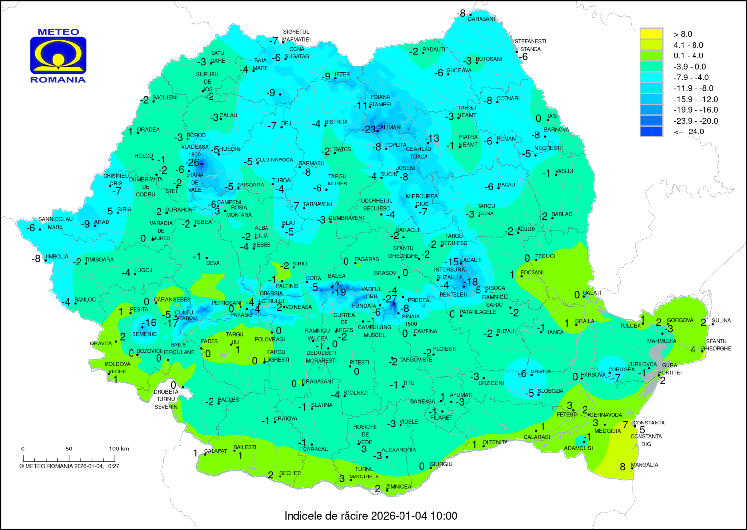 În zona de munte a judeţelor Caraş-Severin, Mehedinţi, Gorj şi Hunedoara, îndeosebi la altitudini de peste 1400 m, va continua să ningă temporar abundent, iar stratul de zăpadă nou depus va fi de 20…30 cm (echivalent în apă de 20…30 l/mp). În zona înaltă vor fi rafale de 80…90 km/h, va fi viscol puternic şi vizibilitate redusă.